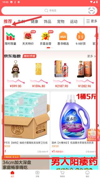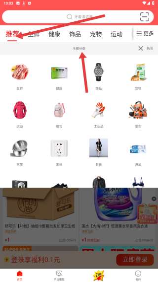 3、推荐频道,点击分类按钮展开全部分类,涵盖生鲜、健康、饰品等多品类,方便用户按类别查找商品,快速定位所需,提升购物效率。