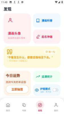 3、趣味附加功能丰富。发现板块包含高清动漫头像库、今日运势抽签等小功能。为阅读漫画增添更多乐趣,让每一次使用都充满小惊喜。