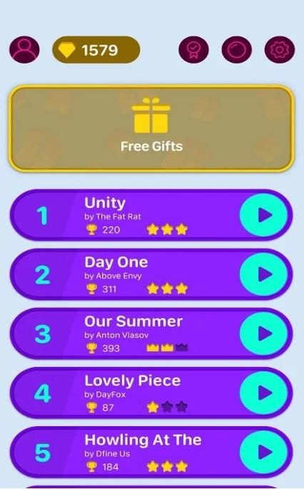 节拍弹跳游戏中跟着节奏的节拍,却空着悄悄进行跳跃,躲避障碍,然后向前冲刺,收集金币,并能够最后到达三个皇冠顶点就可以满分过关了。不过没有关系,完成一半就失败了,也是可以重新参与,或者是就保留这次记录去玩新的挑战。