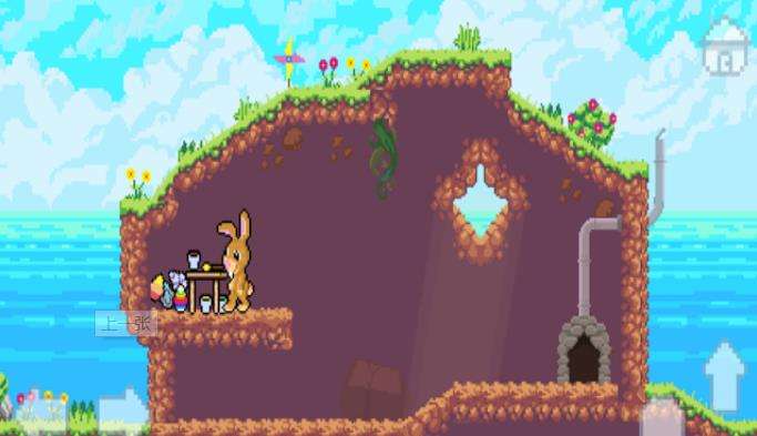 1、复古像素画面里面以海洋与天空为背景,然后岛屿上有木桥,还有小兔子的家。