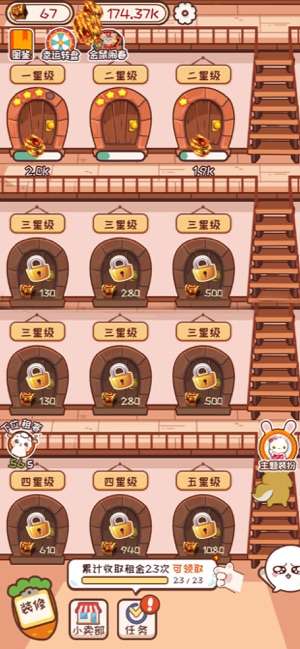 兔子旅社在这款游戏中玩家们的是一个兔子老板拥有以下属于自己的旅社,一开始的房间数量很少只能够容纳几个客人在这里短暂的居住,为了能够满足更多客人们的居住要求开始收益一些材料还有金币完成扩建升级的任务,为了提高收益还在自己的旅社中开始建设小卖部,客人们能够在里面购买基础的生活资源,之后可以自己开个旅社的餐厅,这样就可以解决客人们的吃饭问题了。