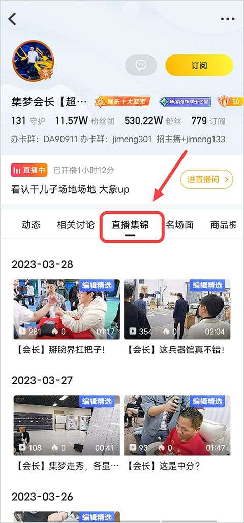 2、进到该主播的动态界面点击“直播集锦”即可查看之前的直播回放。