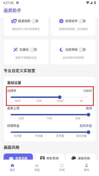 4、滑动到底部,可以自定义分辨率、音质、纹理质量