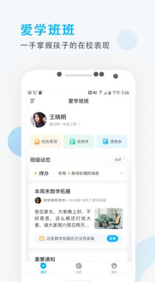 1、通知和学习任务:查看老师发布的学校通知和学习作业,支持提交通知回执和多种格式的作业。