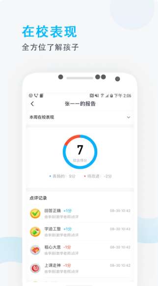 2、成绩单和课堂评价:查看老师发布的成绩单和孩子在校的生活学习状态。