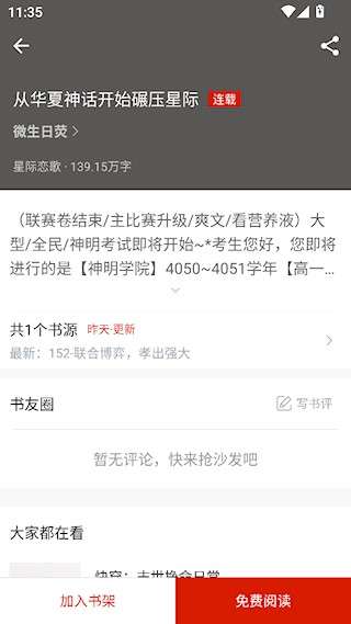 2、喜欢的小说可以加入书架,点击免费阅读后提供多种书源选择。