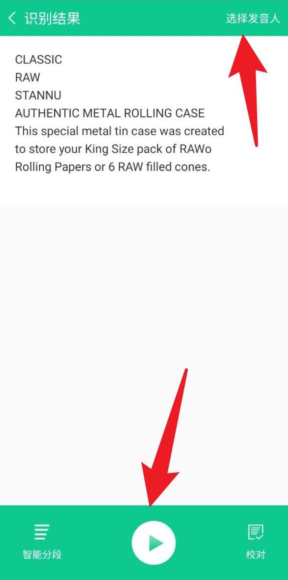 3、拍照完成后自动跳转识别页,可查看提取的文字内容,点击底部播放键即可开启语音朗读。