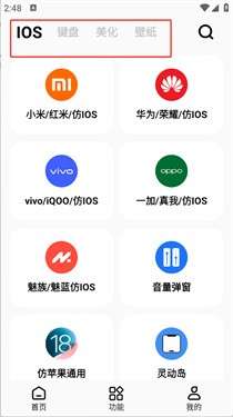 2、进入软件首页之后,用户可以看到软件顶部栏有着仿ios主题、键盘美化以及壁纸美化板块等功能。