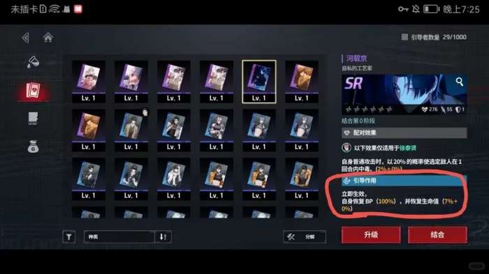 2、核心效果:引导效果均为“BP回满+额外加成”(攻击提升、暴击概率提升、回血等),前期无高品级卡时,优先选带回血加成的卡。