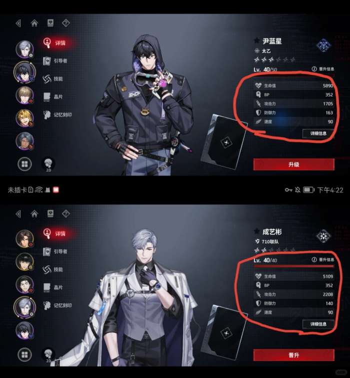 3、避坑提示:前期不养尹蓝星(数值低、机制差,40级晋升后伤害不及同等级成艺彬)、无伤害技能的角色及SR奶辅——全输出队足以通关前三章,SR奶辅奶量低(大招基础奶量最高15%,与被奶角色血量挂钩),SR Buff辅战斗力弱、上buff概率低(基础最高不超30%)。