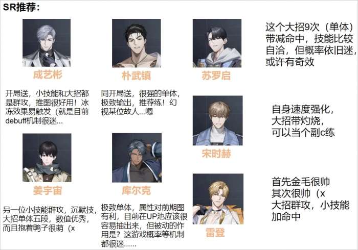 ◦ 朴武镇(官方赠送,对单输出)、成艺彬(官方赠送,对群输出,大招60%概率给敌人上debuff,游戏内罕见高概率控场);