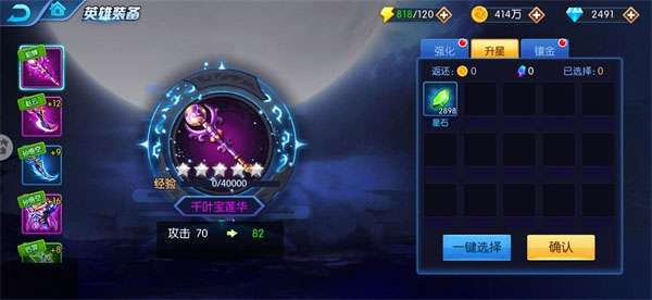 2、装备升星。消耗星石可提高装备属性,装备品质越高,消耗的星石越多,但属性提升也越多。