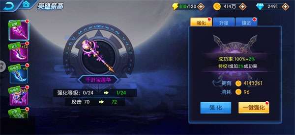 1、强化装备等级。消耗金币可提高装备等级,是最直接的提升装备属性的方式,为了方便镇魂师们强化装备,我们还提供“一键强化”功能。