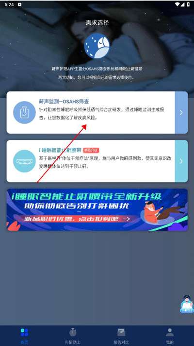 1、睡前打开鼾声护理应用程序界面。
