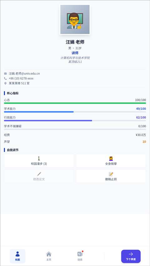 3、进入游戏主界面后,打开档案页即可实现双重功能:既可以查阅个人的详细信息,也能进行多种自我调节操作。比如开启校园漫步模式放松身心、选择全身按摩缓解压力,或是投入到论文修改中提升专业能力。