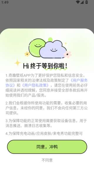 1、打开软件,首先就能看到用户协议页面,点击下方的同意进入软件。