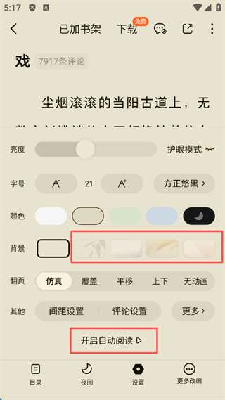 7、阅读体验可以随意设置字号大小,背景颜色等等,并且还可以开启自动阅读,解放双手。