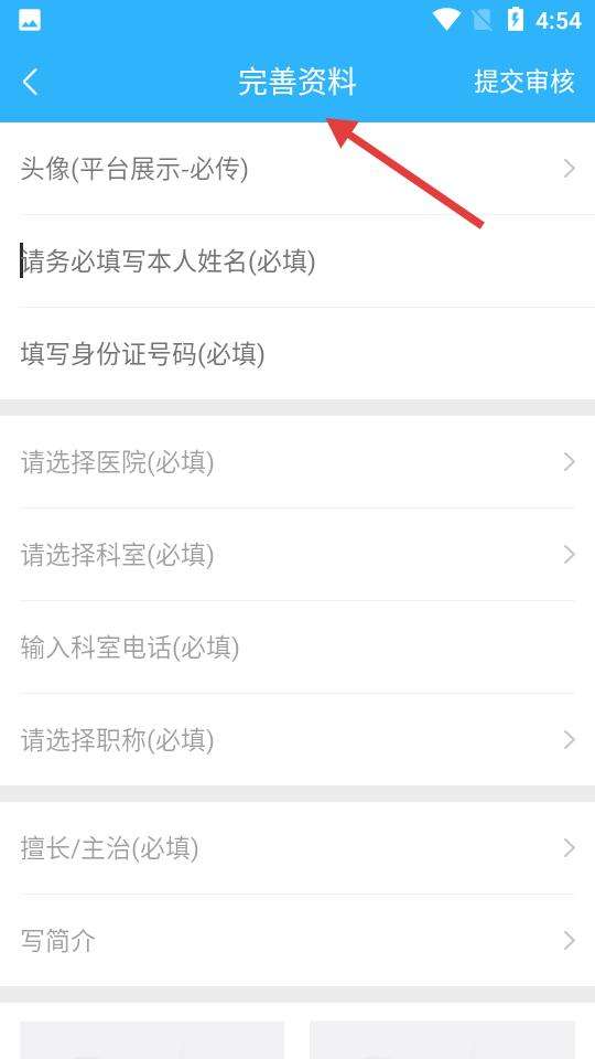 3、点击完善资料,头像、姓名等多项必填,还有医院、科室等信息待填,完成后可提交审核。