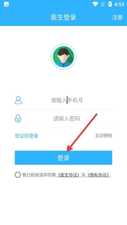 1、点击登录页,蓝白配色简洁,输入手机号、密码,勾选协议后可登录,还有验证码登录及忘记密码选项。