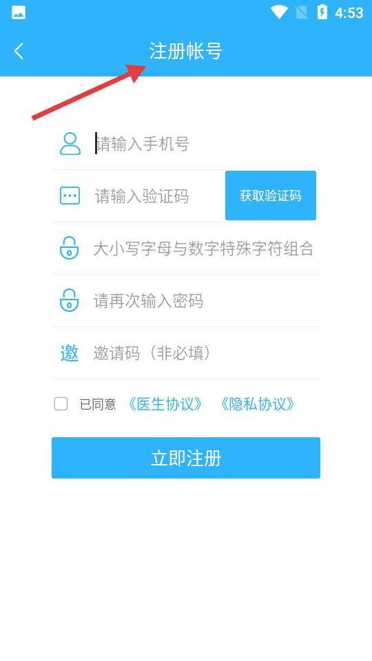 2、点击注册账号页,需填手机号、验证码与密码,邀请码选填,同意协议后点立即注册,开启注册流程。