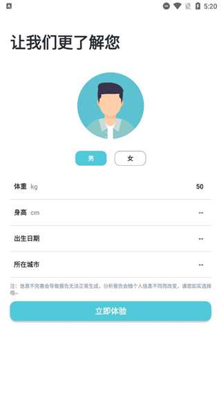 1、下载好优梦思app后,点击进入,首先输入一些简单的身体数据,app会根据您的数据进行分析推荐。