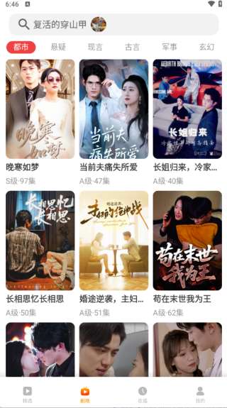 2、在软件剧场页面,您可以查看都市、悬疑、军事和奇幻等短剧类别。
