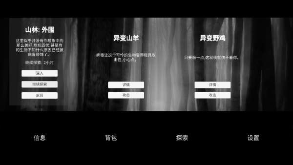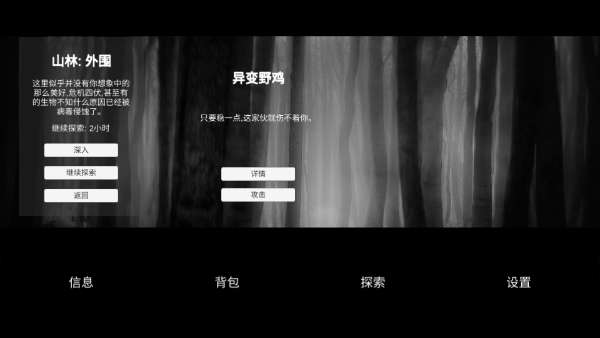 6、随后我选择了山林进行拾荒,在山林外围遇见了一只变异野鸡,这时你要点击野鸡下面的详情,看看这只鸡的攻击率等综合力量来对比自己的攻击力以及根据提示“只要稳一点,这家伙就上不着你”来判断是否可以攻击这只鸡,据小编分析是可以打败这只野鸡的,所以我点击攻击,果然轻松把这只野鸡拿下。
