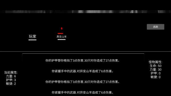 8、如果你选择了攻击变异山羊,可以看到你的护甲替你格挡了3点伤害,而30只对你造成了27点伤害,你的武器对变异山羊只造成了6点伤害,很明显打不过,你必须点击逃跑,才能残喘的活下去。