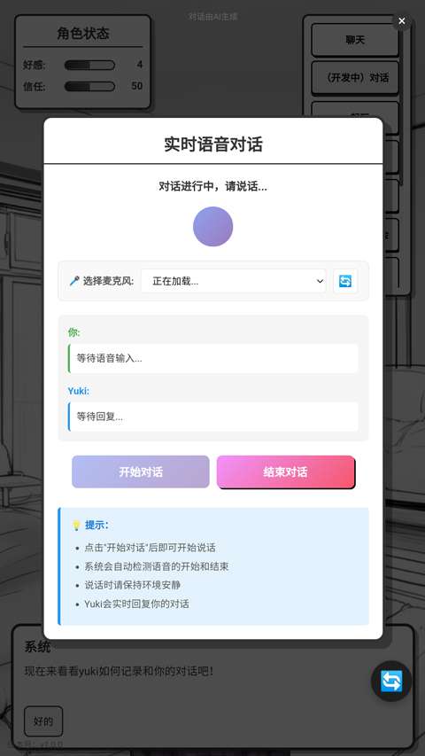 4、而且游戏支持实时语音对话,你可以使用麦克风与Yuki语音聊天;