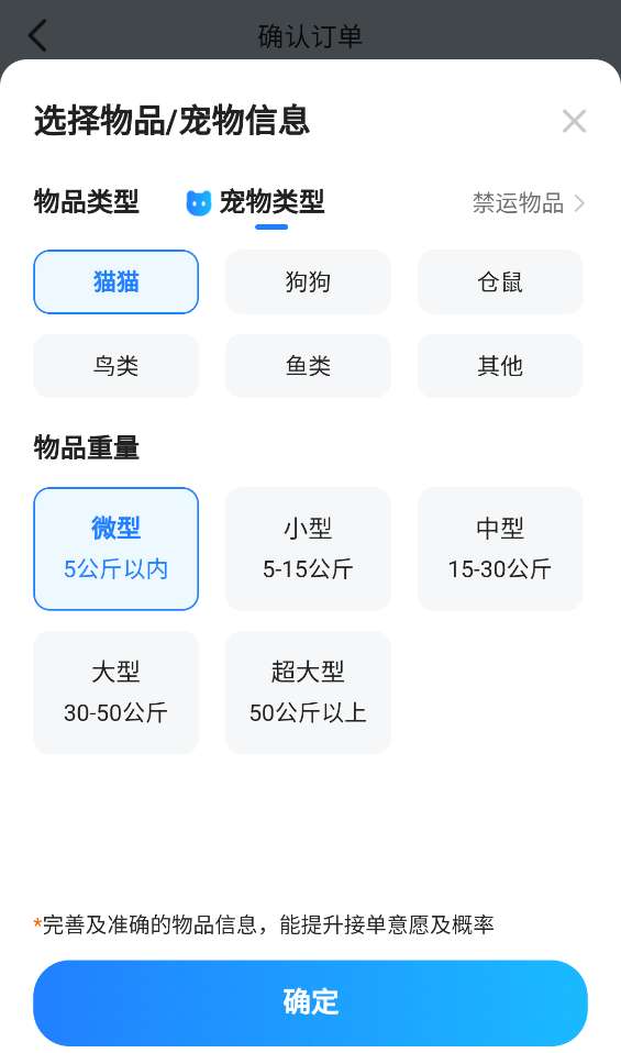 2、设置完成后,选择需要登记的宠物类型和重量,然后单击“确定”。