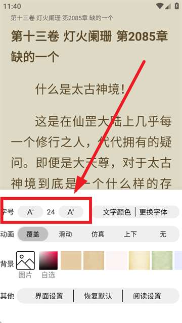 1、进入小说阅读界面,点击屏幕中间,点击设置。