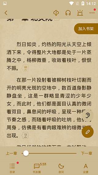 5、阅读界面下方可以对阅读相关设置进行更改,也可以在这里把小说加入书架。