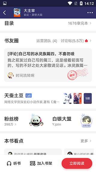 4、书籍详情中可以看到小说的基本介绍和目录等相关信息,我们可以选择听书,加入书架或者立刻阅读。