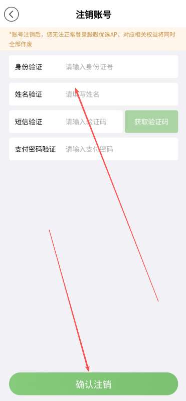 4.最后在注销账号页面中,输入身份验证、姓名验证、短信验证登内容之后点击确认注销即可。