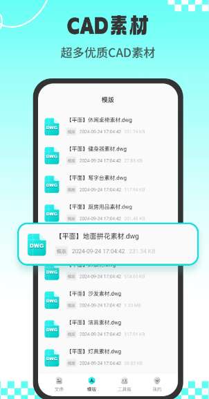4、手机CAD素材模板 它包含常规符号、图形、零件、背景网格和其他有助于加快设计工作的元素。 请由你选择多个素材模板。 大幅提高设计效率,减少重复劳动,保持设计一致性。