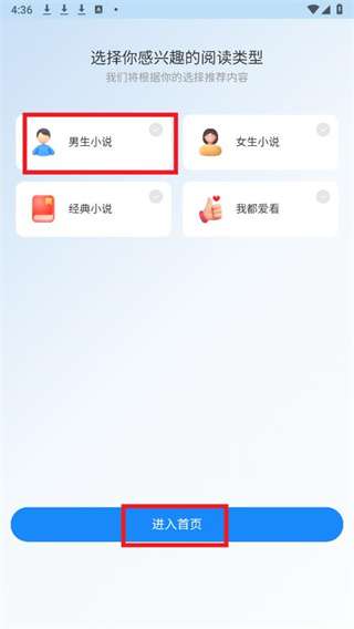 2、进入其中,按照要求选择大家的性别,然后选择个人喜欢的小说类型。
