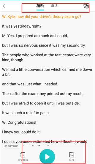 3、用户可以选择精听或是跟读,选择精听的话,用户可以自己调节倍数,点击全文播放即可开始收听。