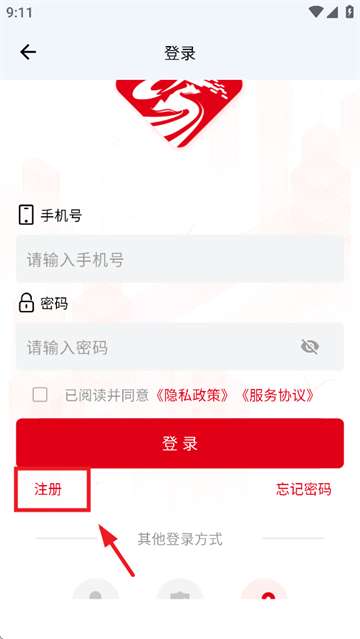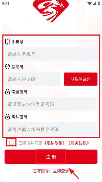 4、输入手机号,验证码,密码,勾选已阅读并同意 《隐私政策》 《服务协议》,点击注册即可。