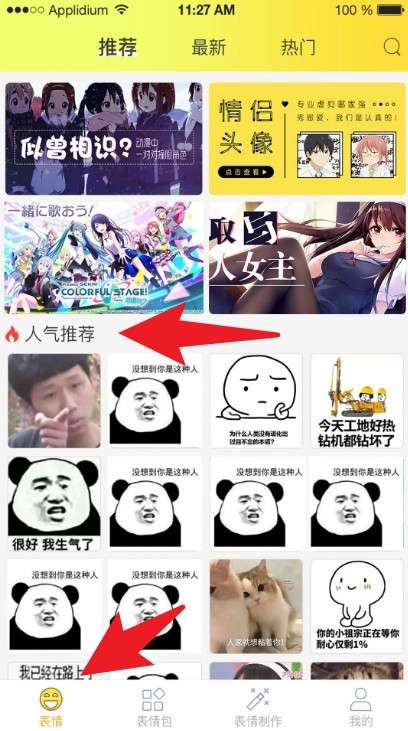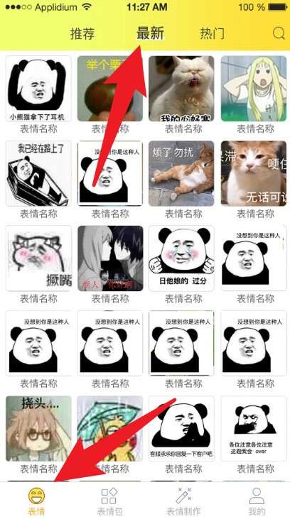 1、进入App后预设停留在「表情」分页,可在推荐、最新、热门中滑动浏览热门表情图。