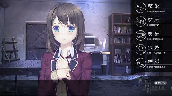 《我和她的世界末日》是一款集微量养成元素与Galgame元素于一身的SLG游戏。某一天,世界末日毫无征兆地来临,玩家与女主角一同被困于地下室,陷入绝境。此时,你需要合理分配手头现有的资源。而面前的女孩对你极度不信任,在这般绝境之下,你必须做出抉择。这是一个“我”和“她”在世界末日背景下,被层层谜团环绕的故事。