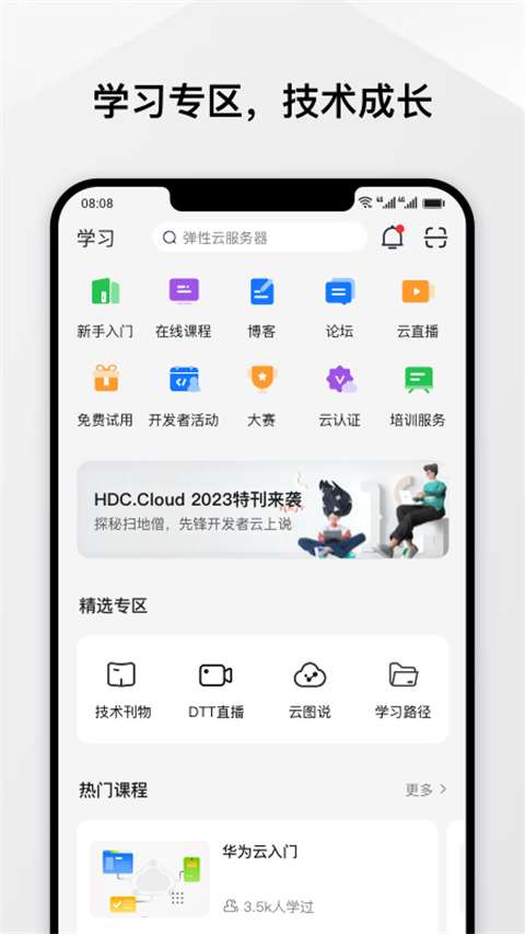 华为云服务移动版创建了一个视频中心学习平台,帮助您提高技术水平,掌握行业趋势,并提供丰富的技术在线课程、名人直播分享、会议活动等内容。