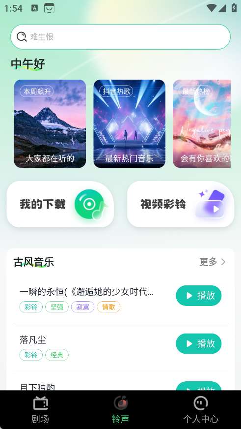 2.铃声页面有本周飙升的热门铃声供你选择,还设有我的下载和视频彩铃等版块,还有丰富的古风音乐资源。