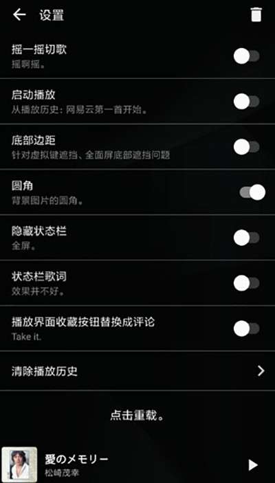4、进入设置页面后,用户还可以尝试打开“摇一摇切歌”、“状态栏歌词”、“底部边距”等服务,以获得更好的播放体验。