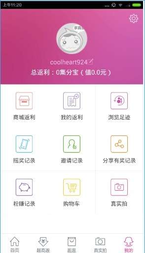 3、进入软件主页,即可看到0元秒杀、超实惠、9.9包邮、品牌特卖、商城返利、充值返利、返利订单、签到摇奖等功能。