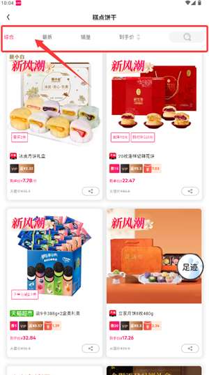 2、可按综合或最新等方式排序,筛选合适的糕点饼干商品。