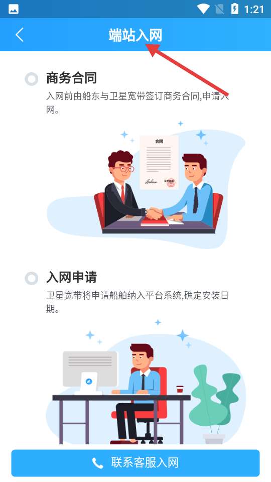 3、端站入网界面详细说明入网流程,先签商务合同,再申请入网,底部设联系客服入网按钮,引导用户操作。