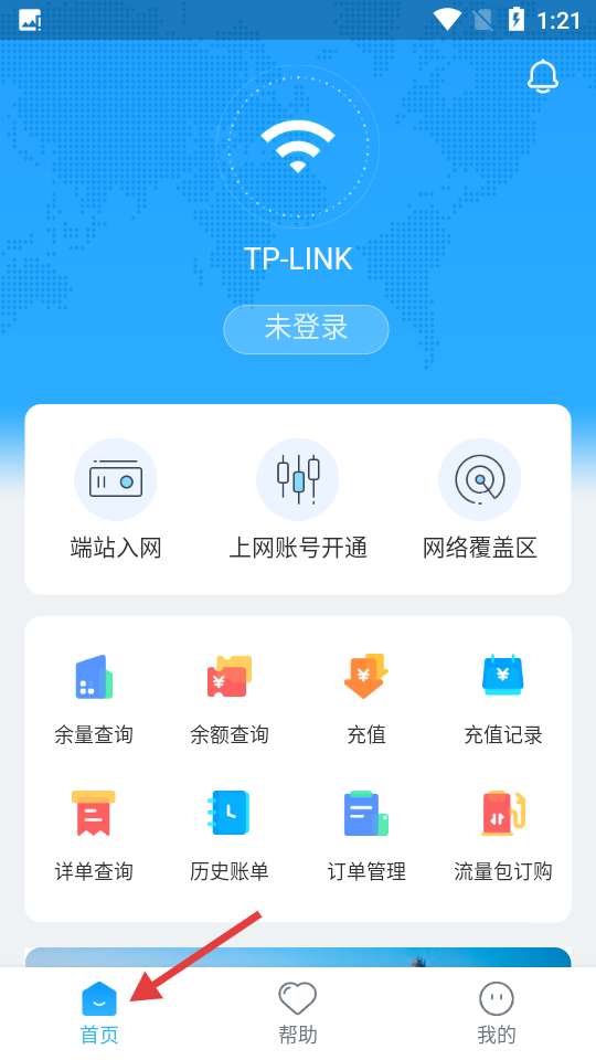 1、首页以蓝色为主色调,显示未登录状态,设有端站入网、上网账号开通等功能,方便快捷管理网络业务。