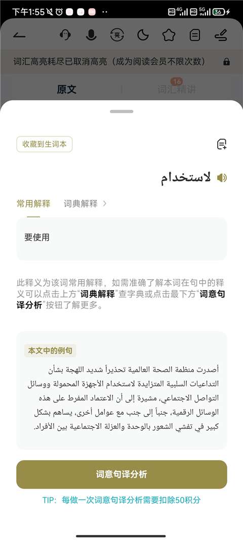2、接着选择一篇文章,点击文中词汇,长按生词,可收藏至个人生词本。