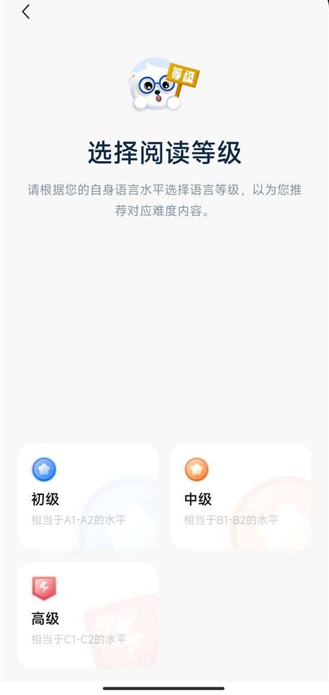 1、进入应用首页,首页根据自身语言水平选择阅读等级。