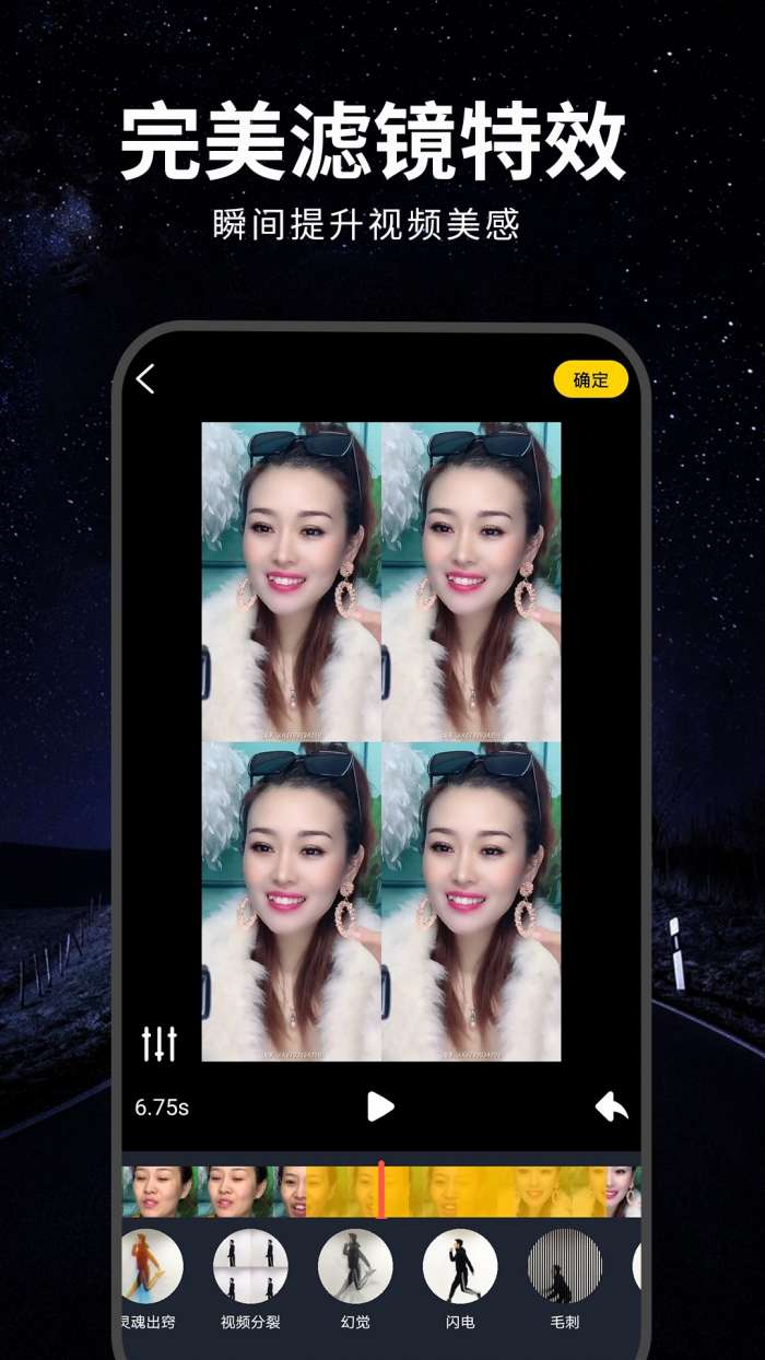 2、独特的滤镜和彩色背景,模糊背景和Glitch等特效,调节视频的亮度,对比度,饱和度等。